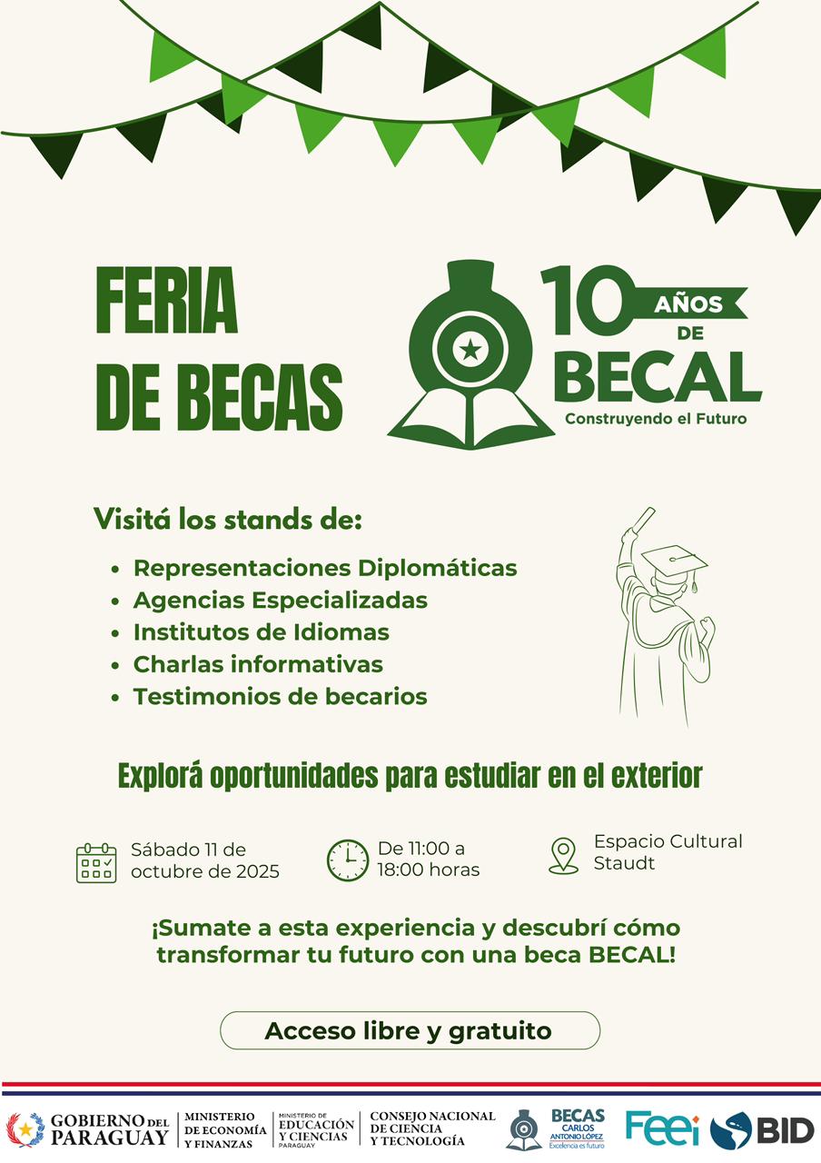 Stands informativos de representaciones diplomáticas, agencias especializadas, institutos de idiomas, así como de instituciones oficiales, testimonios de becarios y charlas informativas son algunas de las propuestas de la Feria de Becas “BECAL, 10 años Construyendo el Futuro”, en el marco de la conmemoración del décimo aniversario del Programa Nacional de