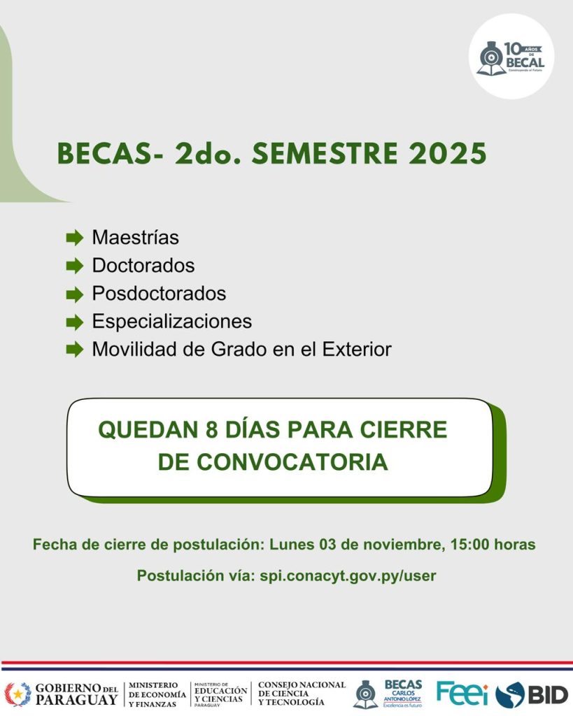 Los interesados en becas para cursar programas de maestrías, doctorados, posdoctorados, especializaciones y movilidad de grado en el exterior a través del Programa Nacional de Becas “Carlos Antonio López” (BECAL) del Ministerio de Economía y Finanzas (MEF), tienen hasta el lunes 03 de noviembre de 2025, hasta a las 15:00 horas, para cerrar su postulación.