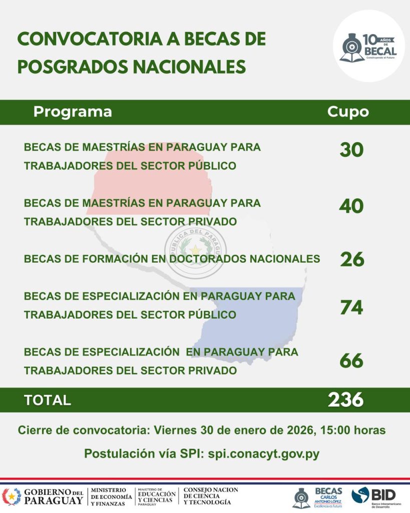 El Programa Nacional de Becas “Carlos Antonio López” (BECAL) del Ministerio de Economía y Finanzas (MEF) informa que está habilitada, desde este jueves 06 de noviembre, la postulación a más de 200 becas de la Tercera Convocatoria de Posgrados Nacionales para hacer Maestrías y Doctorados y de la Primera Convocatoria para cursar Especializaciones en Instituciones de Educación Superior (IES) de nuestro país.