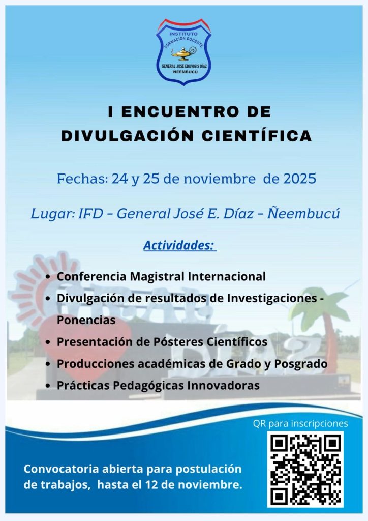 Nicanor Antola Segovia, quien hizo una Maestría en Docencia de las Ciencias Naturales en la Universidad Pedagógica Nacional (UPN) de Colombia, a través del Programa Nacional de Becas “Carlos Antonio López” (BECAL) del Ministerio de Economía y Finanzas (MEF), coordina el “Primer Encuentro de Divulgación Científica y Feria Pedagógica” del Instituto de Formación Docente “General José Eduvigis Díaz” del Departamento de Ñeembucú, que se realiza los días lunes 24 y martes 25 de noviembre de 2025.