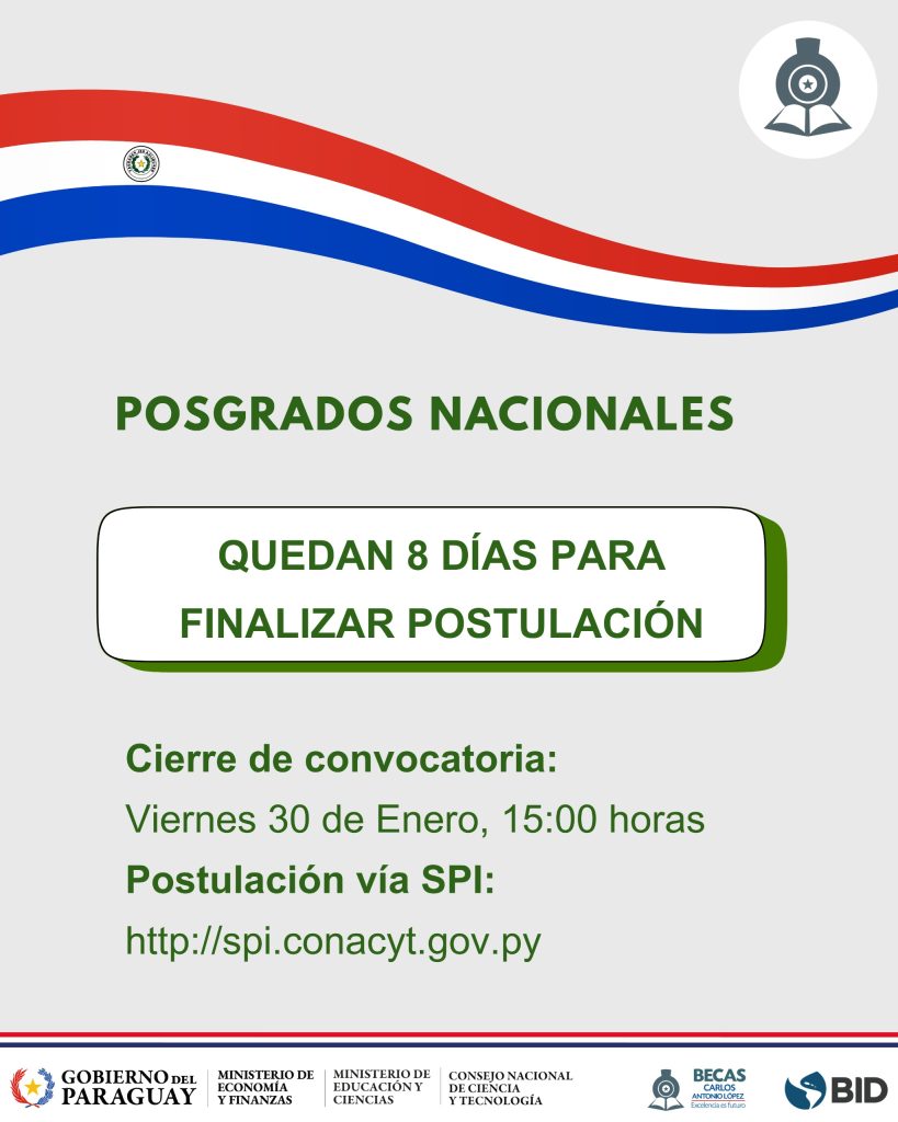 Las personas que iniciaron su postulación a una de las más de 200 becas de la Convocatoria de Posgrados Nacionales del Programa Nacional de Becas “Carlos Antonio López” (BECAL) del Ministerio de Economía y Finanzas (MEF) tienen tiempo hasta el viernes 30 de enero de 2026, hasta las 15:00 horas, para completar todos los puntos solicitados y finalizar su postulación en el Sistema de Postulación a Instrumentos (SPI) https://spi.conacyt.gov.py/user, de manera que tenga validez.