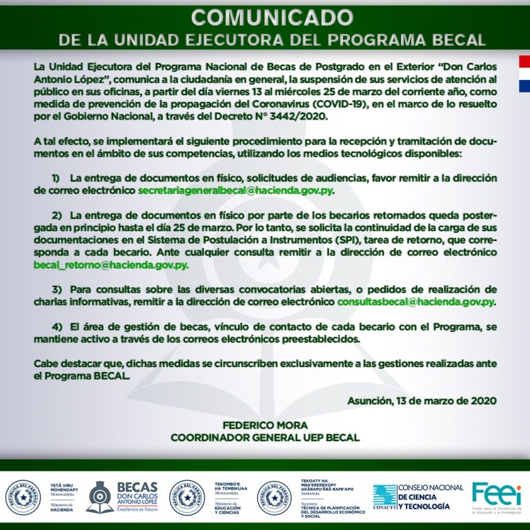 13/03/2020 La UNIDAD EJECUTORA DEL PROGRAMA BECAL, suspende atención al público y